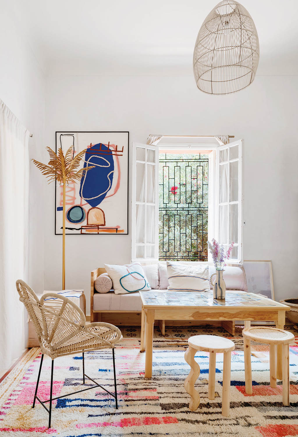 Belgian Laurens Lennart, founder of the clothing and home accessories brand LRNCE, moved to Morocco in 2015 after graduating from the Royal Academy of Arts in Ghent. Inspired by the work of local tanners, ceramicists, and weavers, she began designing bags, shoes, rugs, and ceramics that she created alongside artisans in their workshops. And she decorated her own home, a small one-story cottage with a shaded porch, using her favorite creative techniques.